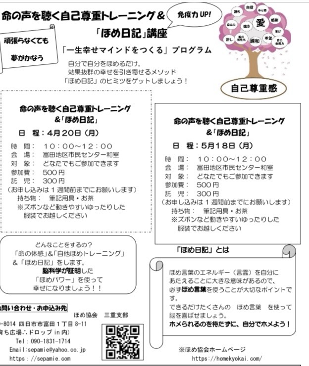 三重県で「ほめ日記」と「命の声を聴く自己尊重トレーニング」を開催しています